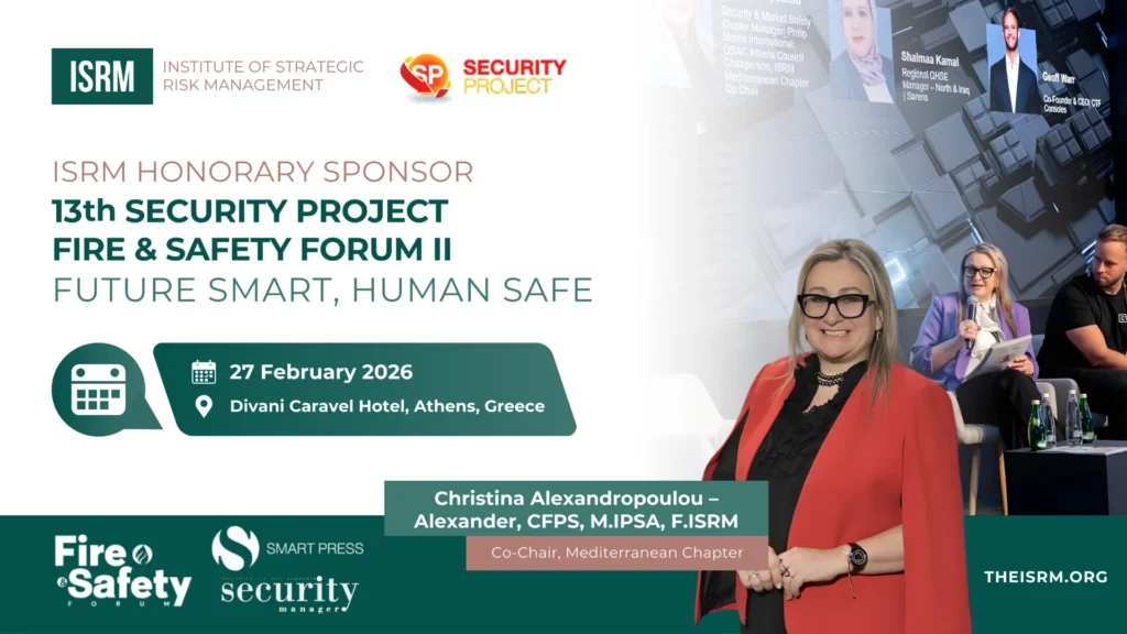 The Institute of Strategic Risk Management (ISRM) is proud to serve as an Honorary Sponsor of the 13th Security Project – 2nd Fire & Safety Forum, taking place on 27 February 2026 at the Divani Caravel Hotel in Athens, Greece. This year’s theme “Future Smart, Human Safe” captures a defining reality of modern risk leadership: […]