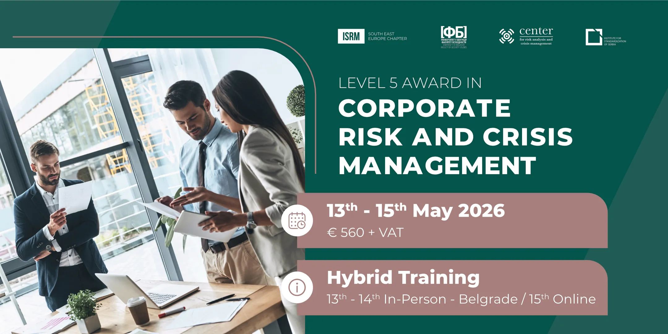We are pleased to announce the ISRM Level 5 Award in Corporate Risk & Crisis Management, taking place in Belgrade on 13th – 14th May 2026 (in-person), followed by an Online Executive Session on 15th May 2026.