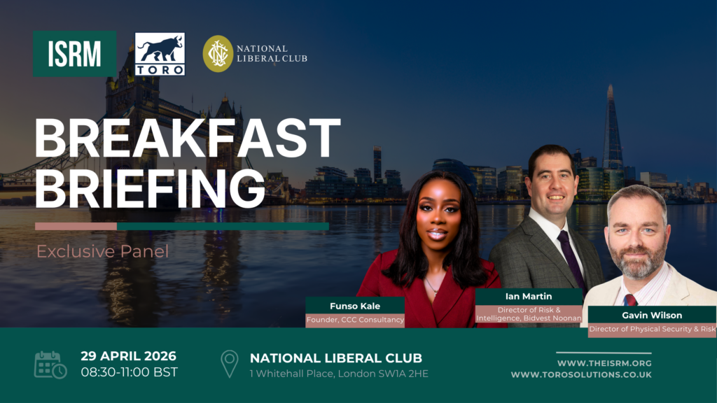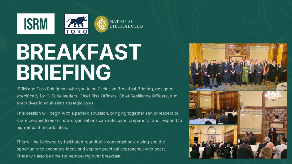 ISRM and Toro Solutions invite senior leaders to an Exclusive Breakfast Briefing created for C-Suite executives, Chief Risk Officers, Chief Resilience Officers and professionals in equivalent strategic roles.